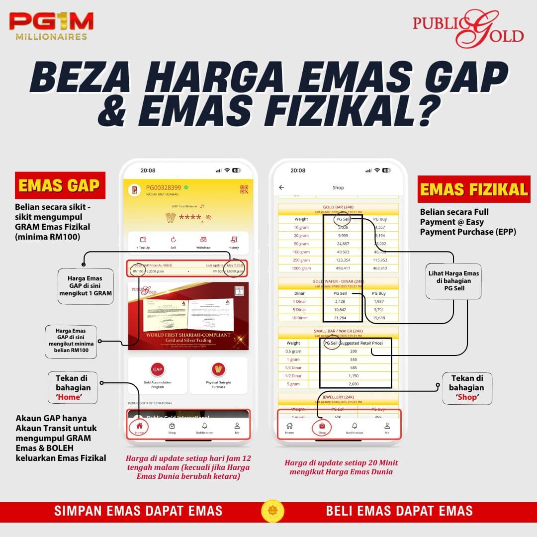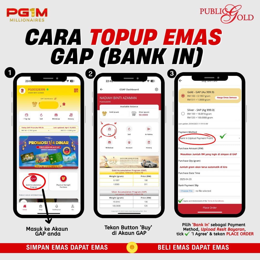 Public Gold menyediakan fasiliti simpanan emas percuma melalui Akaun Emas GAP. Anda boleh beli emas 100% secara online, 24 jam sehari, di mana sahaja